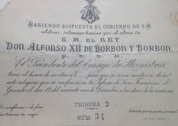 Las últimas informaciones referidas a los lutos están más relacionadas con preceptos de carácter social, de urbanidad y etiqueta, como podemos ver en la invitación a las exequias por el rey Alfonso XII, celebradas en Madrid en 1885: se dispone que los caballeros asistan de uniforme o frac, mientras que las señoras debían ir cubiertas de mantilla negra.