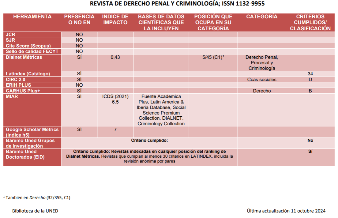 La Revista de Derecho Penal y Criminología está avalada por índices de impacto y métricas que elaboran anualmente diferentes agencias y bases de datos nacionales e internacionales.