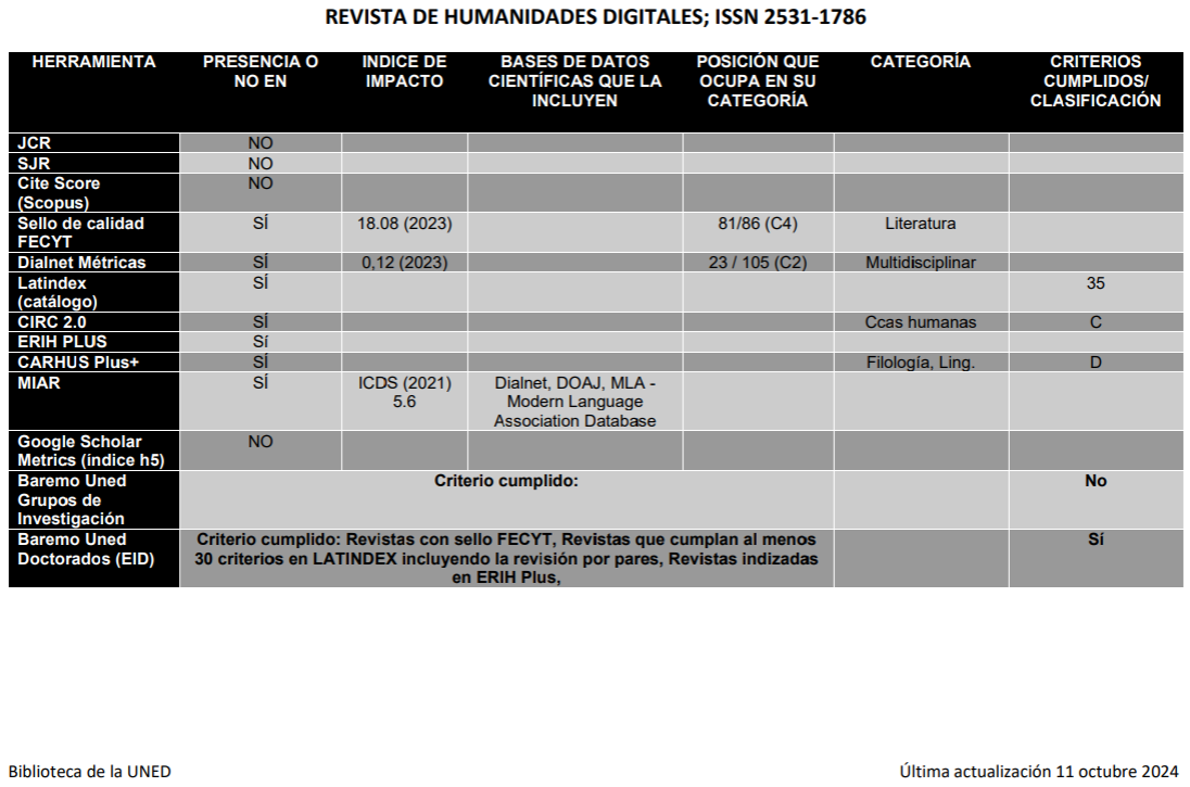 Revista de Humanidades Digitales está avalada por índices de impacto y métricas que elaboran anualmente diferentes agencias y bases de datos nacionales e internacionales.