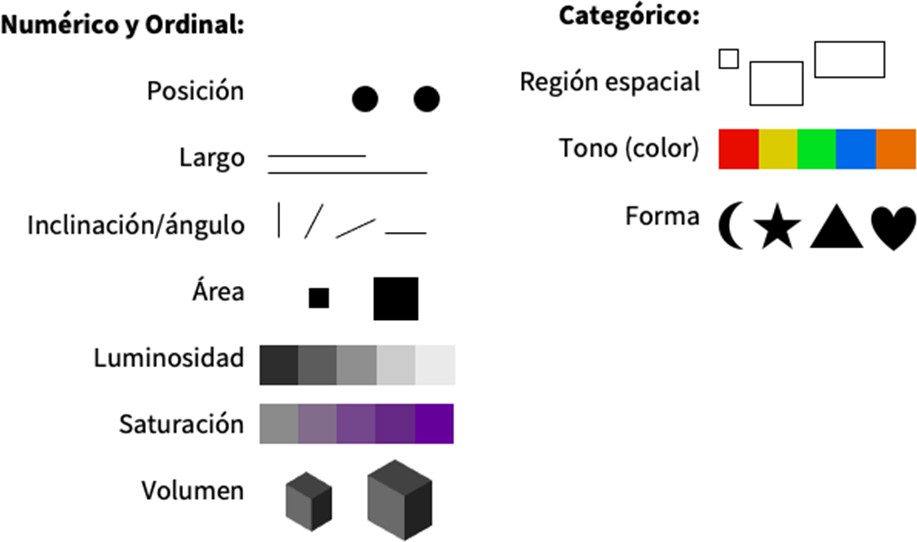 Bajo esta perspectiva icónica, por un lado, los datos deben extraerse de una manera que permita su formalización. Léase, que puedan convertirse en datatypes y que puedan manipularse como datos estadísticos. Luego, se toma un conjunto de primitivos visuales llamados marcas – básicamente, el punto, la línea y el plano– y se transforman ciertos canales o cualidades visuales de esas marcas –la posición, el color, el tamaño, la forma, la inclinación, la cantidad– (ver figura1). Así, digamos, un gráfico de barras transforma un conjunto de datos numéricos en el alto o el ancho de un conjunto de barras. Es decir, transforma el canal del tamaño de una serie de planos de acuerdo a una correspondencia abstracta con los datos. Un gráfico de torta o pie transforma una serie de datos de proporción en ángulos de planos con forma de arco que, como resultado, deben construir un círculo completo. Un gráfico de línea transforma datos continuos en posiciones de marcas con respecto a un eje. Todos estos ejemplos, bastante ortodoxos, por cierto, son icónicos: se parecen a o guardan semejanza con lo que buscan representar bajo un aspecto abstracto hipostasiado.