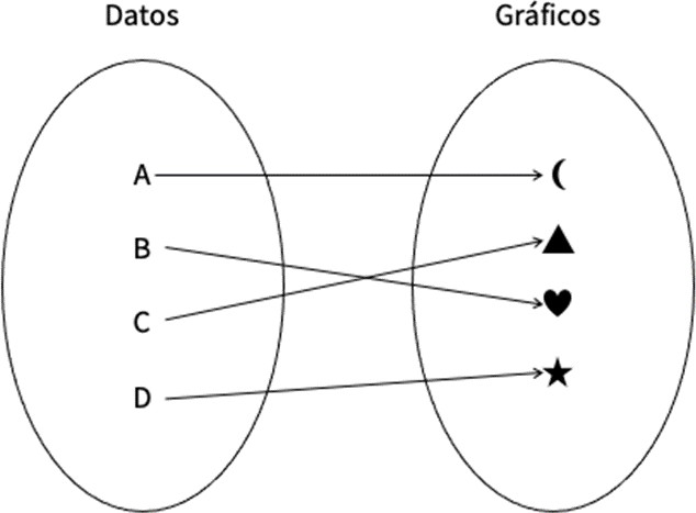 Como propone Wilkinson (2013), podemos entender este tipo de visualizaciones como una función matemática: la información formalizada se encuentra en un dominio, y existe otro codominio que contiene equivalencias formales en términos de marcas visuales y canales (figura 2). Un dato tiene equivalencia en posición, en color, en forma, etc. en el mundo del gráfico. La tarea de quien produce la visualización está en escoger la función correcta, la transformación adecuada para representar el dato, el sistema de conexiones entre dominio y codominio. Así, la visualización icónica es un proceso regulado y protocolizado que evita las ambigüedades y se establece como una herramienta universalizante. No es gratuito que Wilkinson llamara a su estrategia álgebra de la visualización, pues se plantea como una manera consistente matemáticamente de convertir cantidades numéricas y conjuntos discretos en gráficos sin ambigüedades y con procedimientos claramente definidos.