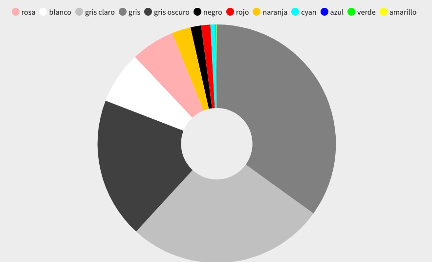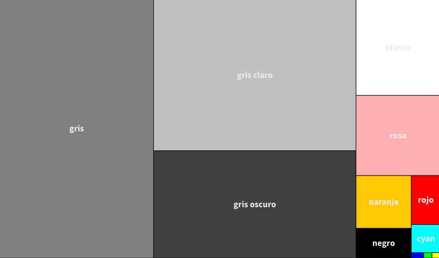 Como lo afirma Lattmann (2018), los modelos son construcciones icónicas que buscan representar aspectos de semejanza de un objeto parcialmente, pero que tienen el beneficio de poder hacer evidentes rasgos que no serían captados fácilmente. Consideremos un ejemplo. Las gráficas que se presentan en las figuras 3, 4 y 5 son visualizaciones icónicas de dos tipos de datos obtenidos a partir del procesamiento del catálogo razonado digital de la artista colombiana Beatriz González2. El primer tipo de dato es una clasificación categórica de la paleta de colores predominantes en cada una de las obras presentes en el catálogo. Cada paleta de colores predominantes está compuesta por diez colores en formato RGB obtenidos usando la librería Color Thief3 del lenguaje de programación JavaScript. Posteriormente, los datos RGB de las paletas fueron convertidos por aproximación en datos categóricos, usando la siguiente lista de doce colores: amarillo, azul, blanco, cian, gris, gris claro, gris oscuro, naranja, negro, rojo, rosa y verde. El segundo tipo de dato es el conteo numérico de la presencia de los colores seleccionados en las paletas de colores. Cada una de las visualizaciones utiliza los mismos datos, pero corresponde a una función visual diferente: la figura 3 es un gráfico de barras que transforma el conteo en el largo de las barras, la número 4 es un gráfico de dona que transforma cada conteo en un ángulo acumulativo, y la 5 es un treemap que transforma el conteo en un área rectangular. Todas las gráficas transforman los datos categóricos en colores equivalentes al color que representan. Como se puede observar, las tres gráficas permiten captar con mayor o menor precisión que existe una preponderancia de colores grises en la obra de Beatriz González –aunque esto se debe principalmente a artefactos de la digitalización: el color de fondo en esculturas o el color de papel en dibujos–, y que hay una preferencia por ciertos matices particulares, como el rosa, el naranja, el rojo y el cian
