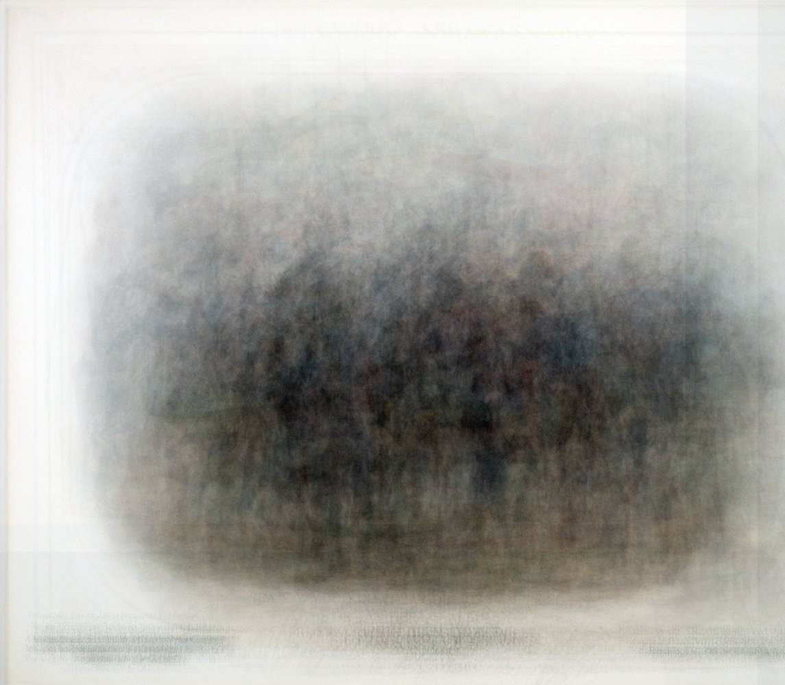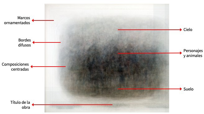 Observemos un ejemplo, la superposición de una serie de obras en acuarela en formato horizontal del pintor costumbrista colombiano Ramón Torres Méndez5 (figura 9). La superposición fue obtenida a través de un proceso de suma de colores con el software abierto ImageJ, siguiendo el proceso descrito por Ferguson (2017). A través del uso directo del objeto que queremos estudiar –la serie de obras propiamente–, y a través del proceso de disponer en una sola imagen todo el conjunto visual, redujimos la producción a un solo momento, a una sola imagen que conjuga toda la obra. Este es un ejemplo de sampleo o muestreo, es decir, de la extracción de fragmentos directos del objeto para obtener una versión reducida en términos de información. También es un ejemplo de síntesis por medio de superposición. Estos dos métodos constituirían la función de contacto elegida. Las cualidades de las pinturas no han sido procesadas en datos estadísticos, y lo que tenemos es, más bien, una especie de promedio indéxico, una huella dejada por la luz de la exposición de todas las imágenes, similar al método fotográfico clásico de la múltiple exposición. Tal proceso nos permite hacer conjeturas sobre el estilo del artista, sobre decisiones de composición, e incluso sobre el contenido de las obras, como se observa en la figura 10. Aunque esta visualización indéxica es más difícil de leer que las transparentes visualizaciones icónicas, optimizadas para abstraer lo estrictamente necesario, con un poco de esfuerzo abductivo se puede ver que las pinturas comparten ciertas decisiones estilísticas: bordes difusos, en ocasiones marcos ornamentados, representaciones de personas y animales, cierta tendencia a la centralidad, etc