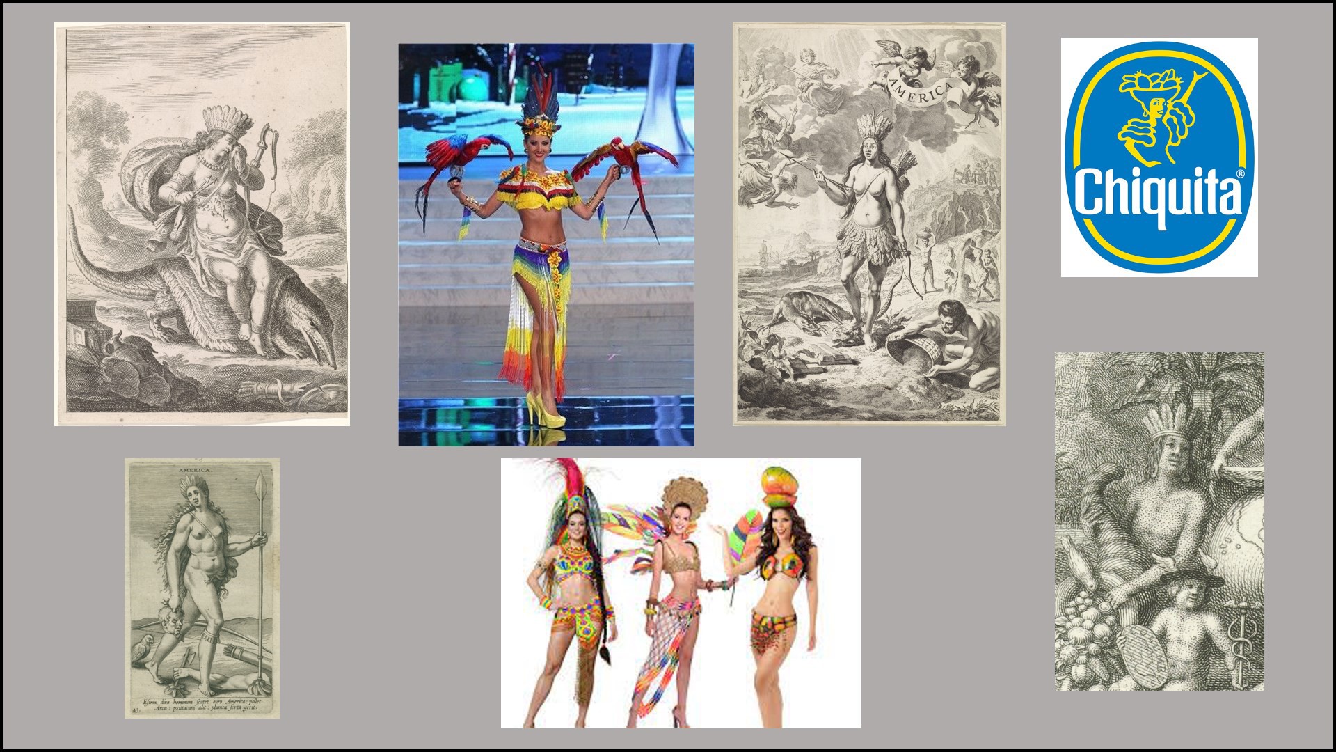 Además de su importancia para el campo específico de la historia del arte, la estrategia de Warburg es adecuada para la investigación humanística en general, y merece una atención especial en la búsqueda de unas visualizaciones fructíferas que se adapten a los intereses investigativos de las humanidades, porque es un método que permite activar con naturalidad los enormes archivos de documentación que registran el pasado. Crear colecciones y disponerlas en un espacio conjunto de percepción visual permite aprovechar las posibilidades del archivo digital sin ocultar el papel de la audiencia en la construcción de significado. En otras palabras, la colección adyacente facilita la creación de conexiones simbólicas para una audiencia porque hace más evidentes las construcciones implícitas de hábitos y tradiciones culturales. Como lo afirmaba Peirce, los símbolos crecen (Short, 2007), es decir, su significado se amplía en la medida en la que se enriquecen las lecturas, los usos cambian y las comunidades complejizan las lectuas, una colección es una captura inmediata de ese proceso. A manera de ejemplo, la figura 12 representa un ejercicio, inspirado en el trabajo de Warburg, en el que se toman diferentes representaciones europeas del continente americano y se disponen junto a imágenes comerciales o de la cultura popular en las que se puede encontrar una iconografía y una serie de códigos simbólicos transversales. Particularmente, la representación alegórica colonialista de América como una mujer semidesnuda que sostiene materias primas y naturaleza tropical