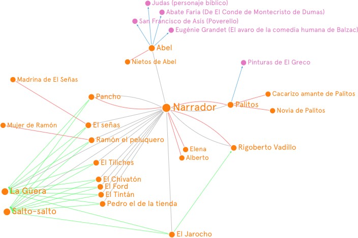 La colección adyacente es un ejercicio interpretativo que requiere de cierto bagaje cultural o de una exploración curiosa de documentos en archivos; así, la computación no suple la construcción de un hilo conductor del sentido o del diseño del gráfico, sino que facilita la recolección y conjunción de elementos dispersos. Sin embargo, como complemento a la colección adyacente pueden producirse otras formas de visualización que ayudan a complejizar las relaciones simbólicas de una manera más concreta y direccionada a través de abstracciones icónicas que procuran conservar estructuras simbólicas. Las visualizaciones de redes relacionales como los grafos y los árboles son, en este sentido, el complemento ideal para la estrategia warburgiana. Como afirma Newman (2010), "una red es una representación simplificada que reduce un sistema a una estructura abstracta que captura solo lo básico de patrones de conexión y poco más" (p.2). Por ejemplo, los grafos, de los que existe un amplio estudio de sus topologías y sus configuraciones matemáticas (Ortega Guerrero, 2016), son una estrategia que permite ver, de una forma relativamente sencilla, relacionamientos concretos como guiños intertextuales o conexiones entre elementos narrativos. A manera de ejemplo, la figura 13 presenta un grafo que sintetiza los personajes más relevantes dentro de los capítulos que componen la historia del Diario de Lecumberri de Álvaro Mutis (1975) junto con las referencias intertextuales que utiliza Mutis para describir a algunos de los personajes