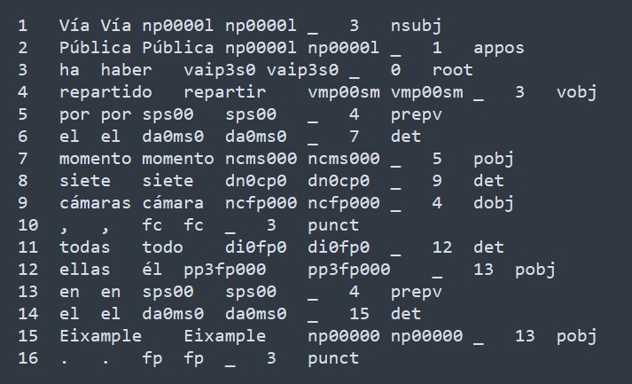 El formato del corpus es CoNLL-2006 (Buchholz & Marsi, 2006)3, y sus campos correspondientes al nivel morfológico son la forma, el lema y la categoría morfológica, mientras que sus campos correspondientes al nivel sintáctico son el identificador del núcleo y tipo de dependencia sintáctica que lo relaciona con él. Puede observarse un ejemplo de oración etiquetada en la figura2.