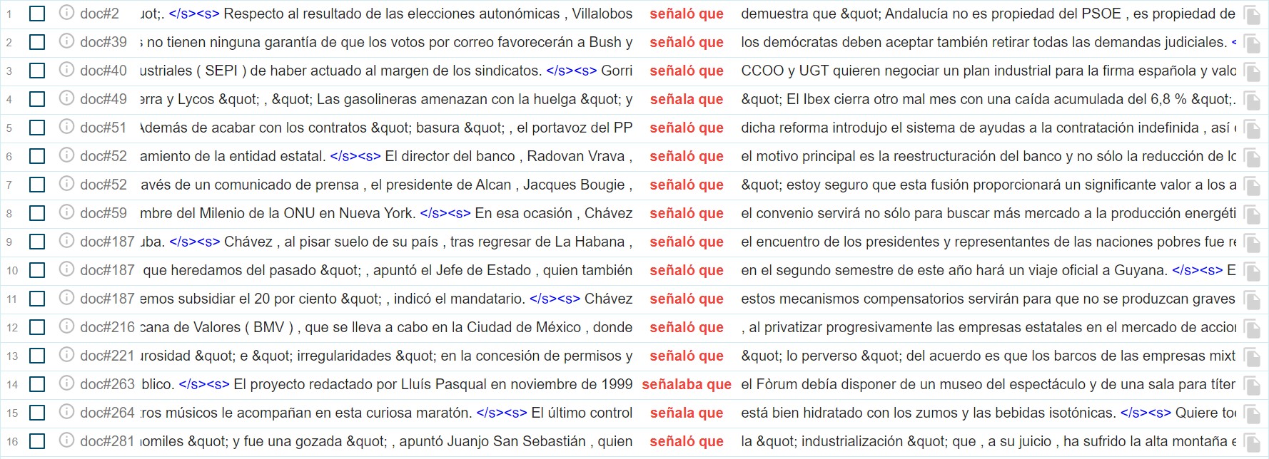 Como puede observarse, si se analizan ambas listas con detenimiento, es necesario realizar un filtrado posterior, especialmente en el caso de creer, ya que estamos interesados en localizar únicamente aquellos verbos en los que lo relevante informativamente sea su completiva, por lo que nos interesa localizar solo las apariciones que contengan una completiva.