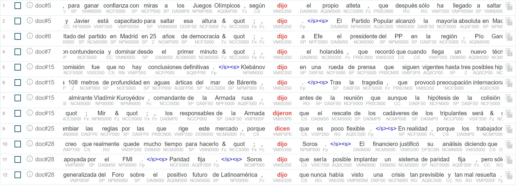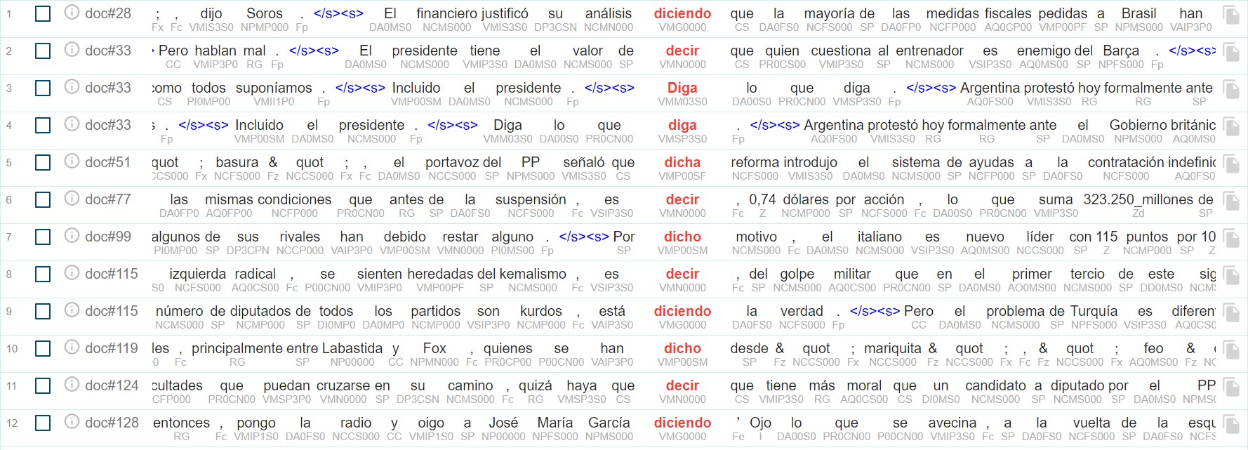 Aunque el total de los resultados devueltos para la búsqueda anterior (116) se corresponden efectivamente con apariciones de como verbo de habla cuyo objetivo directo presenta forma de completiva, no todos los resultados se corresponden con apariciones en la proposición principal, tal y como se exigiría en el marcador descrito en la fase anterior. Gracias a esta capacidad expresiva, dada por la posibilidad de incluir expresiones regulares en las restricciones para cada palabra en el lenguaje CQL, es posible filtrar las apariciones de los verbos de habla y experiencia psicológica de la lista que generamos anteriormente para recuperar solamente aquellos que son verbos principales, ya que, recordemos, nos interesa seleccionar su completiva solamente cuando ésta depende directamente de un verbo principal –y además no constituye un orden ni está en forma no personal–. La sentencia CQL para lograr esto sería, en el caso del verbo decir, [lemma="decir" & tag="VMI.*"], que filtra aquellos verbos principales que no están en forma no personal ni en modo subjuntivo o imperativo, que es el obligatorio para la proposición dependiente en las relaciones hipotácticas. En la figura 6 puede observarse parte de la salida de dicha búsqueda, mientras que en la figura 7 mostramos parte de la salida de su consulta complementaria: [lemma="decir" & tag="VM[^I].*"], que se correspondería con las apariciones del lema decir como verbo no principal de la oración.