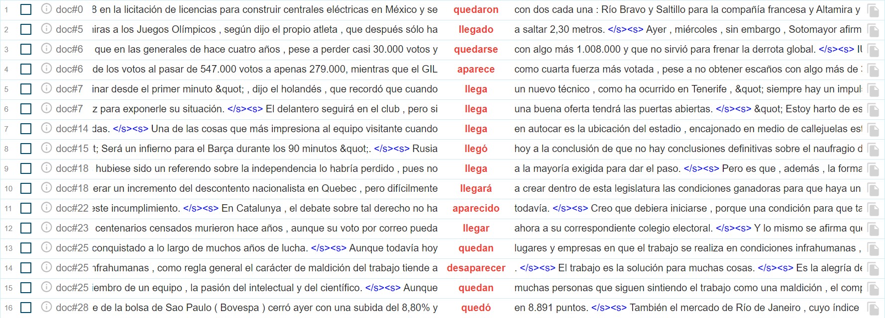 En cuanto a la quinta categoría, referida a aquellas proposiciones cuyo verbo principal es de tipo inacusativo, cuya posición no marcada para el sujeto es la pospuesta al verbo, una opción interesante que proporciona Sketch Engine es la búsqueda a partir de listas de lemas. Al ser la de los verbos inacusativos una categoría que podría considerarse una lista más o menos cerrada, podemos comprobar si los patrones de aparición que hemos observado en nuestra anotación manual se constatan en la totalidad del corpus para una pequeño listado de verbos inacusativos de muestra que se ha comprobado que tienen frecuencias absolutas relativamente altas en el corpus: llegar, faltar, quedar, aparecer y desaparecer. La consulta CQL que ha permitido esta búsqueda ha sido la siguiente: [lemma="llegar|faltar|quedar|aparecerdesaparecer"]. Parte del resultado obtenido puede observarse en la figura 8.