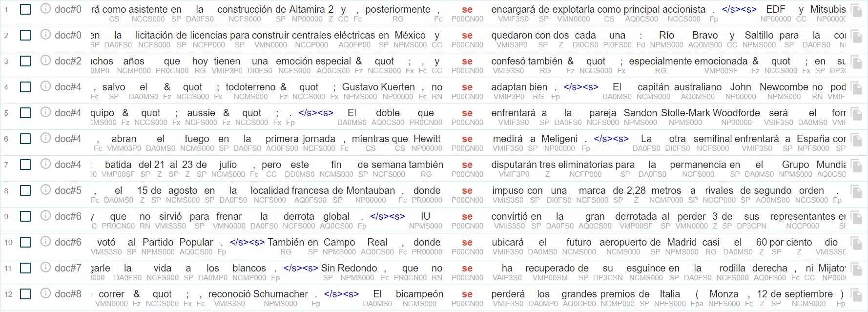 Esta herramienta de concordancias es asimismo útil para localizar pasivas reflejas, que constituyen la última de las categorías relevantes de patrones susceptibles de generar estructuras temáticas diferentes de la no marcada en español, según la cual el tema se materializaría en el sujeto expreso y antepuesto. Sin embargo, a pesar de la expresividad de las búsquedas de Sketch Engine, que sí aportan la potencia suficiente, en ocasiones la anotación automática del corpus no es lo suficientemente detallada como para filtrar los resultados como se desearía. Un caso de filtrado deficiente para una de las categorías relevantes para la casuística recién descrita es el de las pasivas reflejas, que incluimos aquí por ser su orden de palabras no marcado distinto al prototípico para la anotación automática de la estructura temática, que, recordemos de nuevo, rige la anteposición del sujeto. Obsérvese cómo, en el caso de las oraciones sexta y séptima, que comparten todos los rasgos morfológicos que codifican las etiquetas Part of Speech (PoS) tanto del se como del verbo, la anotación de los se no distingue entre sus apariciones en pasivas reflejas –como es el caso de la séptima oración: Este fin de semana también se disputarán tres eliminatorias– y en verbos pronominales –como es el caso de la sexta oración: Hewitt se medirá a Meligeni–.