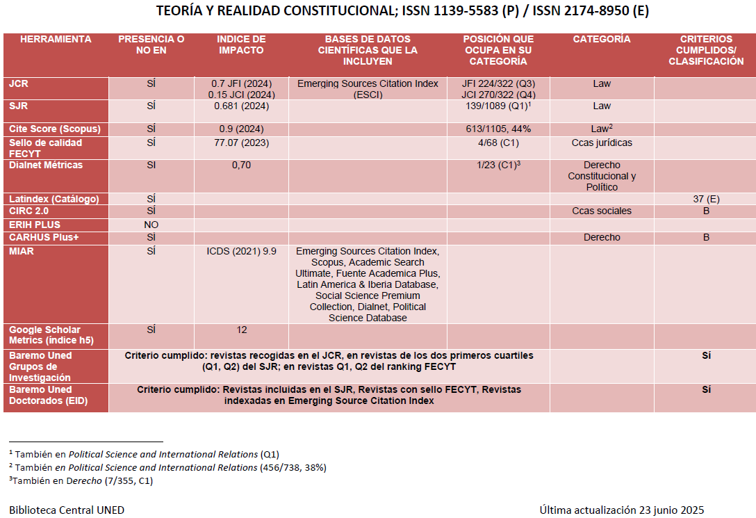 Teoría y Realidad Constitucional está avalada por índices de impacto y métricas que elaboran anualmente diferentes agencias y bases de datos nacionales e internacionales.