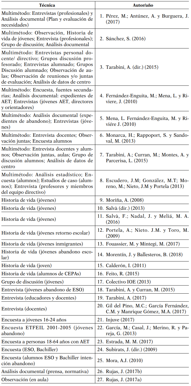 Se consultaron dos fuentes de datos (Dialnet y Google Scholar), aplicando como criterios de búsqueda tres descriptores —exclusión educativa, abandono escolar temprano y fracaso escolar—, incluyendo solamente estudios nacionales realizados en la última década y fundamentados en fuentes primarias. La búsqueda dio como resultado la obtención de 27 trabajos difundidos en artículos, libros e informes, incluidos en el anexo y comentados sucintamente a continuación.