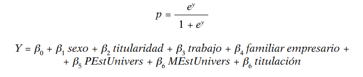 Primero se realiza un análisis descriptivo comparado de todas las variables. Después se aplica la prueba Chi-cuadrado (χ²) para comprobar si existen diferencias significativas entre las respuestas a las variables independientes respecto de la variable dependiente. Por último, se plantea un modelo logit para cada caso de estudio que pondere la influencia de las distintas variables sobre la variable dependiente. Este modelo permite analizar si una variable binomial depende o no de otras variables no necesariamente binomiales, y es útil cuando se desea realizar una interpretación de los resultados a partir de los signos de los coeficientes estimados. El modelo logit planteado representa la probabilidad de que el estudiante sí tenga decidido crear su empresa en el futuro (tomando valor 1), dado un valor determinado de Y que expresa la combinación lineal siguiente:
