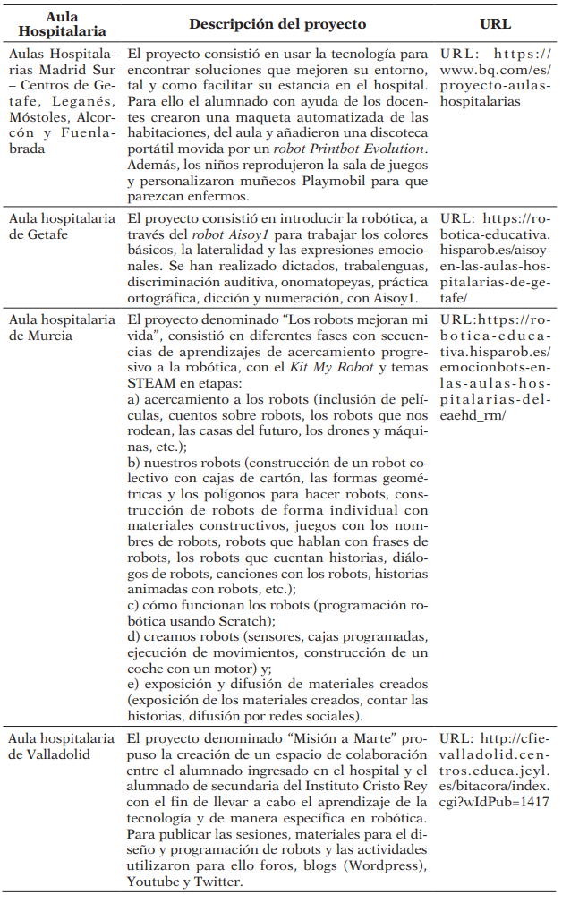El uso de la tecnología, en el AH, debe acompañase de la alfabetización digital, la enseñanza del pensamiento computacional y la programación introducida en los sistemas educativos (Balanskat & Engelhardt, 2015; Bocconi et al., 2016; García-Peñalvo, 2017; Llorens et al., 2017; Ministerio de Educación, Cultura y Deportes, 2018; Pretz, 2014; Resnik, 2013) con ciudadanos que aprendan a “codificar” para ser productores digitales de información, no solo consumidores digitales de la misma (Bers, 2008). El AH, como espacio ubicado en el hospital, tiene como objetivo brindar atención escolar al alumnado en situación de enfermedad en edades comprendidas entre la etapa infantil y la secundaria ( Violant et al., 2009). En el AH se busca también normalizar la vida de los menores hospitalizados, ayudarles a comprender los procesos de su enfermedad. Estudios han demostrado la efectividad de introducir programas de preparación psicopedagógica para reducir y prevenir la aparición de síntomas de ansiedad en pacientes pediátricos hospitalizados (Lizasoáin & Polaino, 1995) y los déficits en el autoconcepto (Polaino-Lorente y Lizasoáin, 1994). Por otra parte, también se les ayuda conectando el hospital con la escuela durante el proceso de hospitalización y ayudándoles a reincorporarse cuando finaliza el mismo (González-González et al., 2011). Dicho espacio es garantizado como recurso público en España, en base al acuerdo en 1998, entre el ministerio de Educación y Cultura, el Ministerio de Sanidad y Consumo y el Instituto Nacional de Salud y toma el perfil de la escuela unitaria (Guillén y Mejia, 2002). Por las condiciones especiales de las aulas hospitalarias, la metodología de trabajo debe presentarse de manera flexible y activa; permitir el aprendizaje basado en proyectos que partan de los intereses y adaptado a las características particulares del alumnado, y fomentar la creatividad, las emociones, la socialización, así como el tener un carácter lúdico-educativo (Antequera & Domíguez, 2015, Barquero, 2017; González-González y Violant, 2015). En el anexo 1 se muestran proyectos llevados a cabo en aulas hospitalaria (AH) de España, con la utilización de algunos de robots para estos fines.