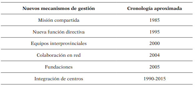 El modelo integrado por la nueva función directiva, equipos de titularidad, fundaciones, procesos de integración y trabajo en red, cuya cronología aproximada describimos en la Tabla 3, es el que está gestionando en la actualidad la mayor parte de la enseñanza católica española. Como se ha podido comprobar, se trata de una respuesta sostenida y readaptada en el tiempo al persistente problema de la escasez de personal religioso.