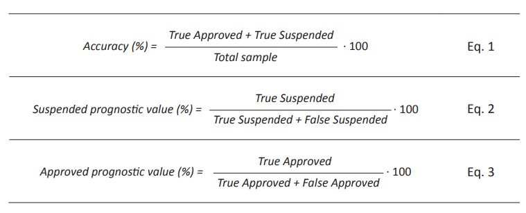 Once the model was obtained, it was applied to the validation data set to obtain classification performance variables. The accuracy of the classification and the suspended and approved prognostic values were computed. These variables were calculated as described in Eqs. (1, 2 and 3).