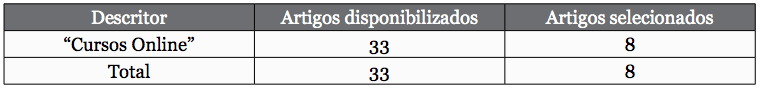 Portanto, a escolha do descritor “cursos online” se deu em função de não existir nenhuma publicação quando a busca foi realizada com os descritores “aprendizagem em cursos online”, “material didático em cursos online”, “estrutura tecnológica em cursos online”, “avaliação institucional em cursos online”. As tabelas apresentadas, a seguir, demonstram o resultado desse levantamento.