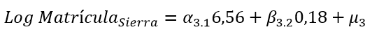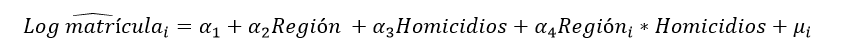 La estimación por Mínimos Cuadrados Ordinarios (MCO), en la que se realizó una diferencia de intercepto y pendientes para cada región, confirmó que la tasa de matriculación se ve afectada positivamente por la tasa de homicidios, pero que los efectos no son los mismos en cada región. A continuación, se presentan los resultados (ecuaciones 4, 5 y 6) para cada área: