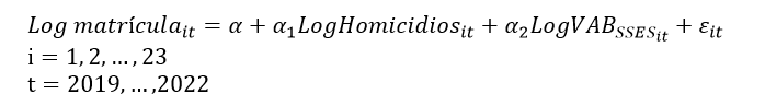 En donde el coeficiente a1 representa la pendiente de la variable logaritmo de los homicidios sobre el logaritmo de la matrícula. El coeficiente a2 representa la pendiente del VAB del Sector Servicios de Enseñanza Superior, como variable de control. La perturbación estocástica del modelo de efectos fijos de panel se representa en eit. La estimación por datos de panel considera la dependencia transversal y estimadores robustos a la heterocedasticidad. En los resultados se presentan dos estimaciones de efectos fijos: las del modelo simple (sin incluir el control del contexto económico de las provincias) y el modelo completo (en el que se incluye la variable de control), esto para verificar la estabilidad del efecto identificado entre la variable explicativa y la explicada, en todas las modelaciones econométricas realizadas.