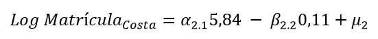 La región Costa tiene una tasa media de matriculación (5,84) menor que las otras dos regiones, con una pendiente negativa (-0,11), este resultado de la región más violenta del país es consistente con la indiferencia que puede tener la población a los hechos violentos. En cambio, las otras dos zonas tienen movimientos positivos ante los hechos violentos como son los homicidios.