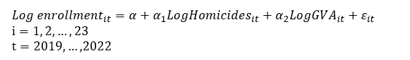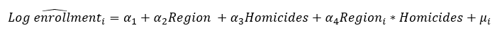 Ordinary Least Squares (OLS) estimation, in which an intercept and slope difference was performed for each region, confirmed that the enrollment rate is positively affected by the homicide rate, but that the effects are not the same in each region. The results (equations 4, 5 and 6) for each area are presented below: