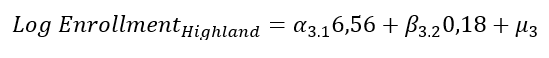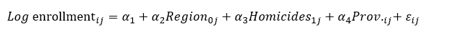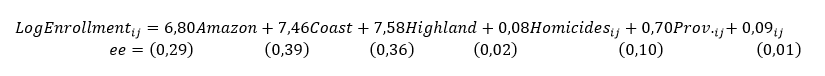 In the mixed effects model, the "logarithm of homicides" was used to reduce the variance between provinces around the country average. Also, the inclusion of the homicide variable seeks to explain the part of the enrollment that is not explained by the country average and by provincial nesting. Likewise, the region was added, not as a nesting level, but as an explanatory variable to determine the direct effects that regional behavior has on enrollment movements. The results are summarized in equation 7: