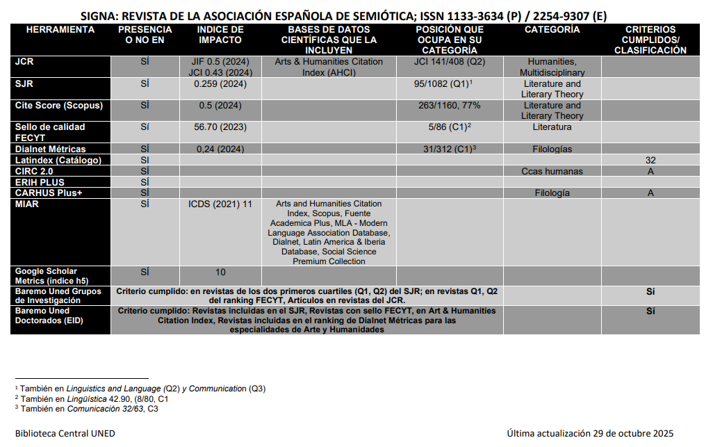 La calidad de la revista SIGNA está avalada por índices de impacto y métricas que elaboran anualmente diferentes agencias y bases de datos nacionales e internacionales. A lo largo de los años, SIGNA se ha situado en posiciones de excelencia investigadora en las categorías de Literatura y Teoría de la Literatura, Lingüística, Filología, Comunicación y Humanidades. A continuación, puede verse la tabla elaborada por la Biblioteca UNED con datos actualizados en octubre de 2025: